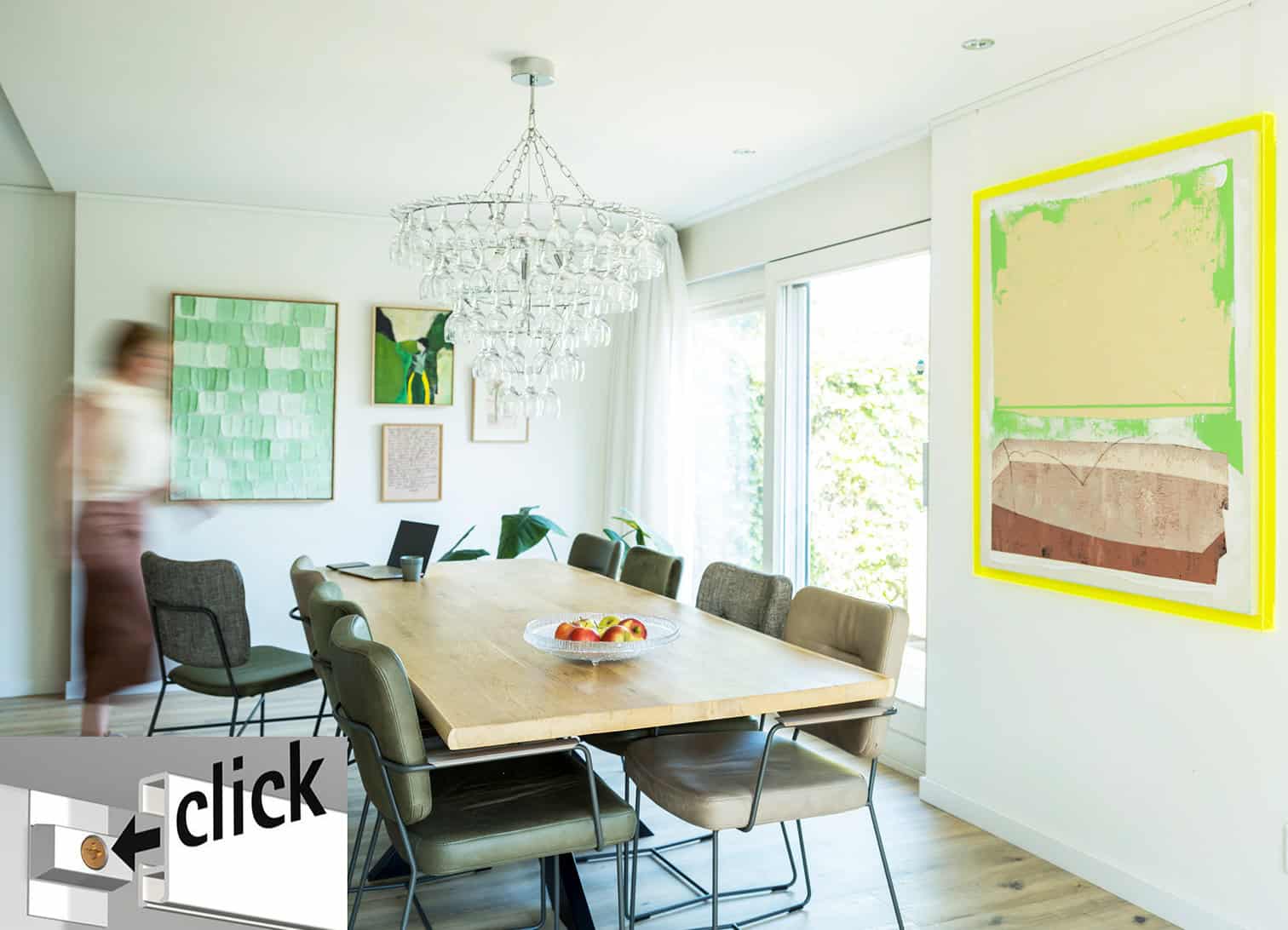 Drill: Choose fixings that suit that suit your wall type. Screw the click and connect attachment clips to your wall, and then use your fist or a rubber mallet to click/tap your hanging rail onto the click and connect clips – too easy!