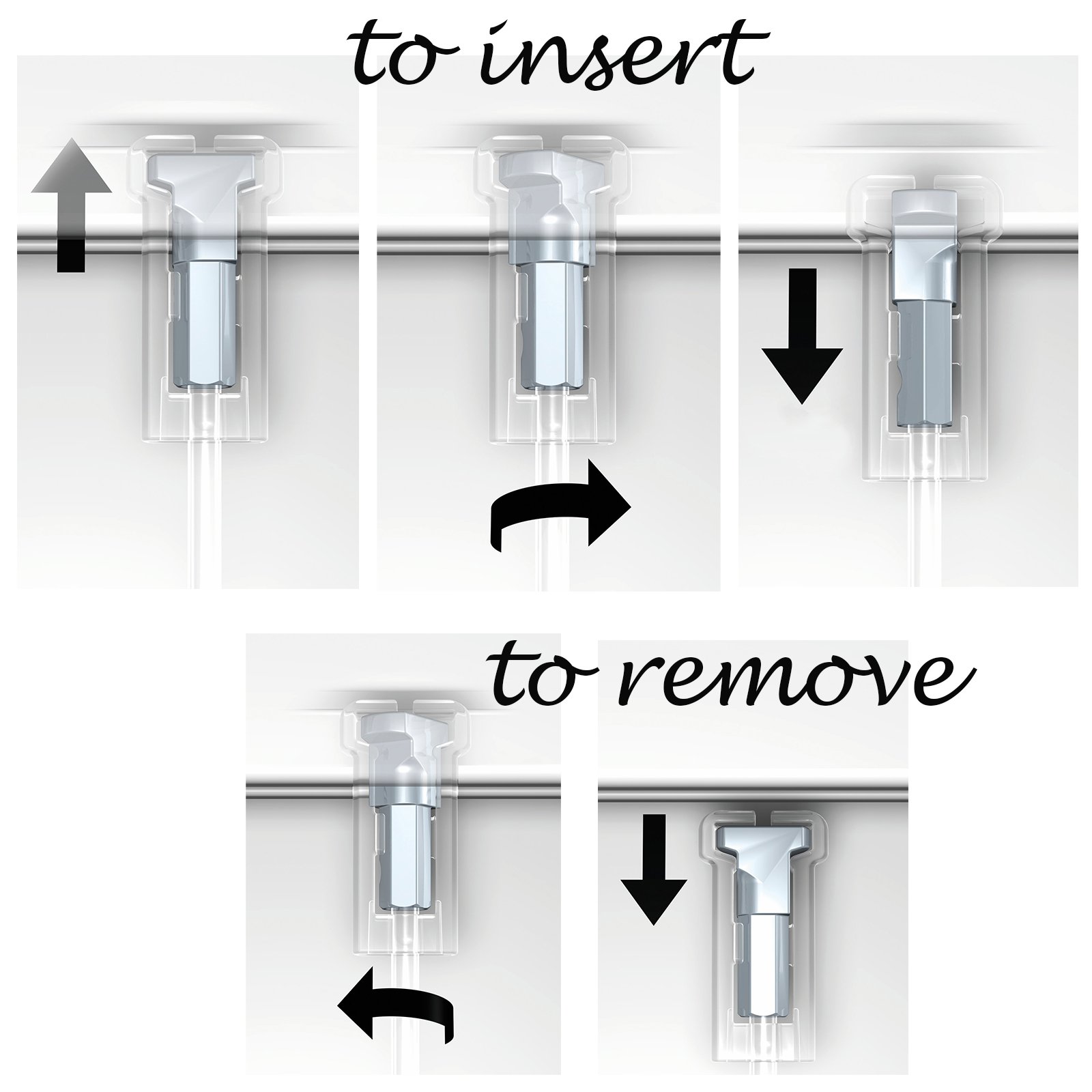 - Itโs innovative โlocking headโ allows the Cliq2Fix hanger to stay locked into the rail yet still slide left and right.