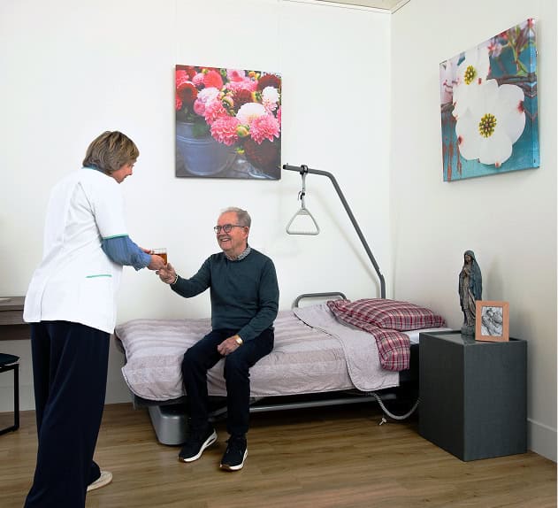 You install it once, high on the walls in rooms and hallways, clear of handrails, beds and equipment. Then you can change picture or resident photos whenever you like.
